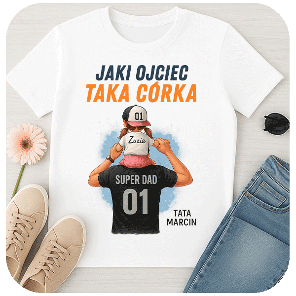 Personalizowana koszulka dla taty Jaki Ojciec Taka Córka z napisem Super Dad to doskonały prezent dla taty. Idealny prezent na dzień ojca, pełen miłości i wyjątkowych wspomnień.