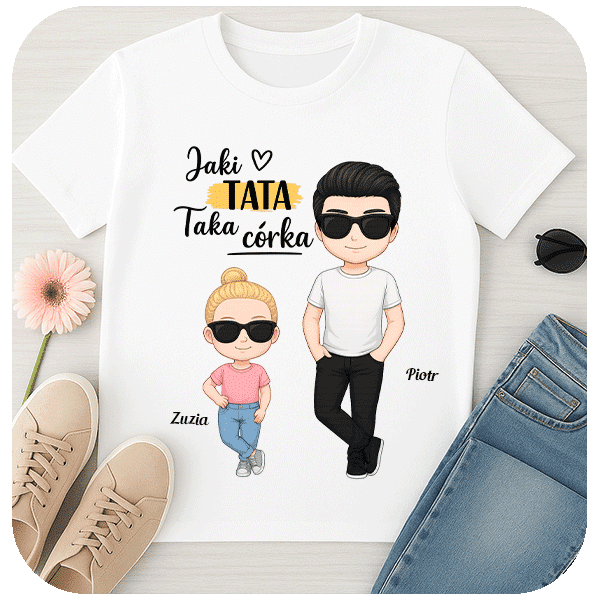 Idealny prezent dla taty z okazji dnia ojca. Personalizowana koszulka dla taty Jaki Tata Taka Córka z blond córką to wyjątkowy prezent na dzień ojca.
