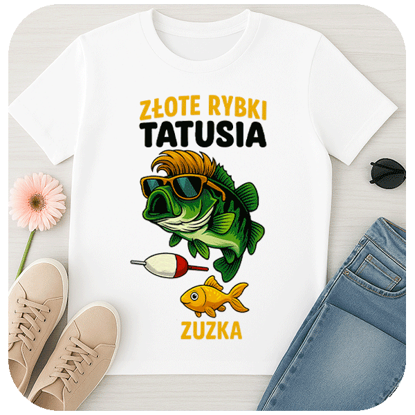 Personalizowana koszulka Złote Rybki Tatusia z imieniem dziecka. Świetny pomysł na prezent na Dzień Ojca, wyjątkowy i osobisty prezent dla taty, który lubi łowić ryby